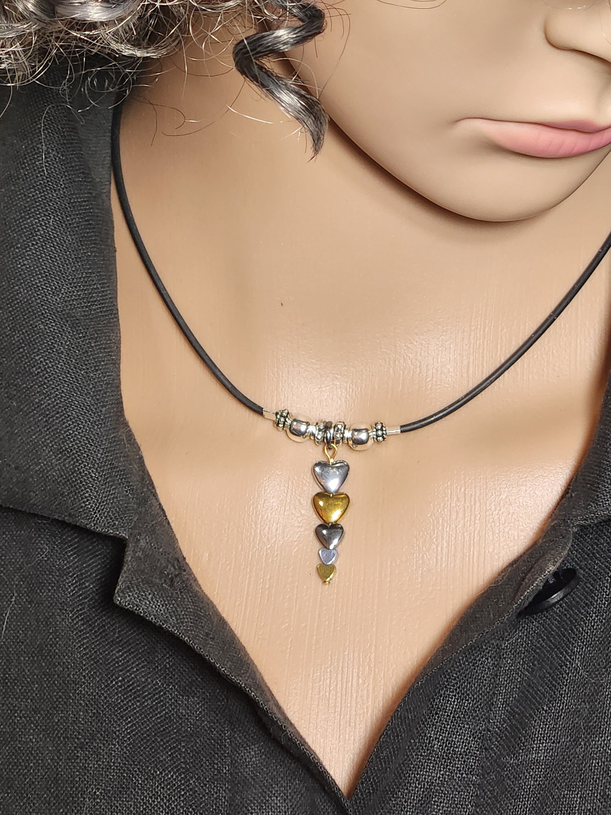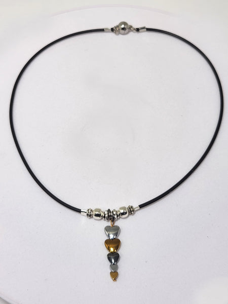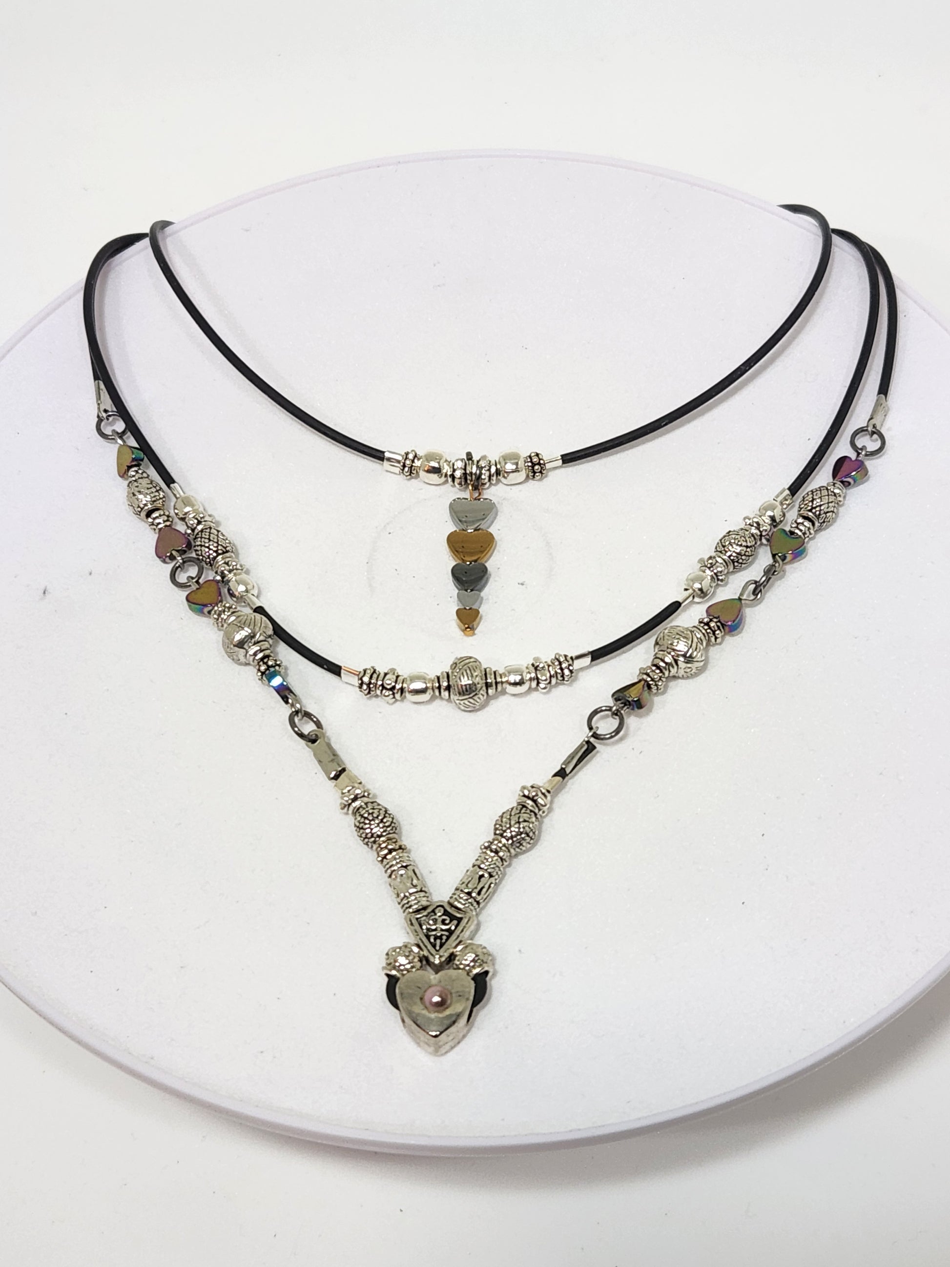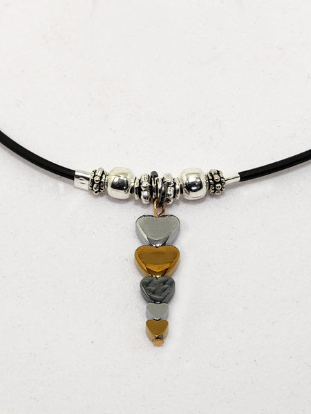 Indulge in the elegance of my handmade 5 Hematite heart pendant choker. This piece features five (in cascading sizes) hearts. Our heart pendant features hematite in Gold, Silver, and natural gunmetal, so this is a piece you can combine with your gold or silver jewelry,
