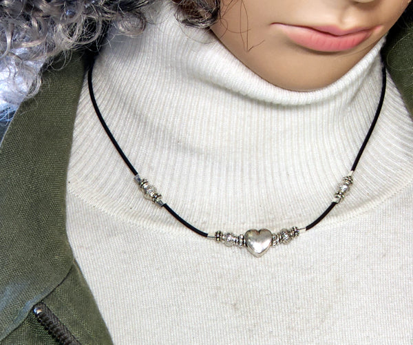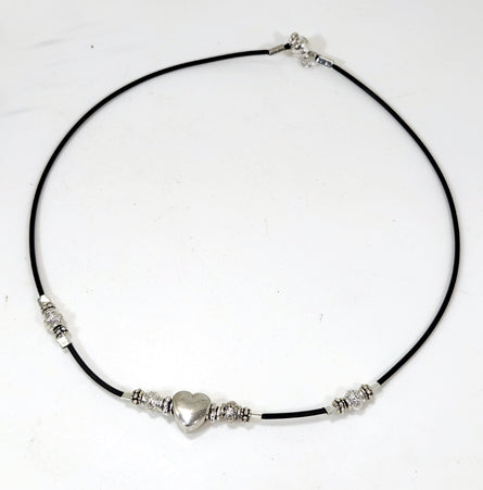 ANTIQUE SILVER PUFF HEART ON RUBBER CORD CHOKER