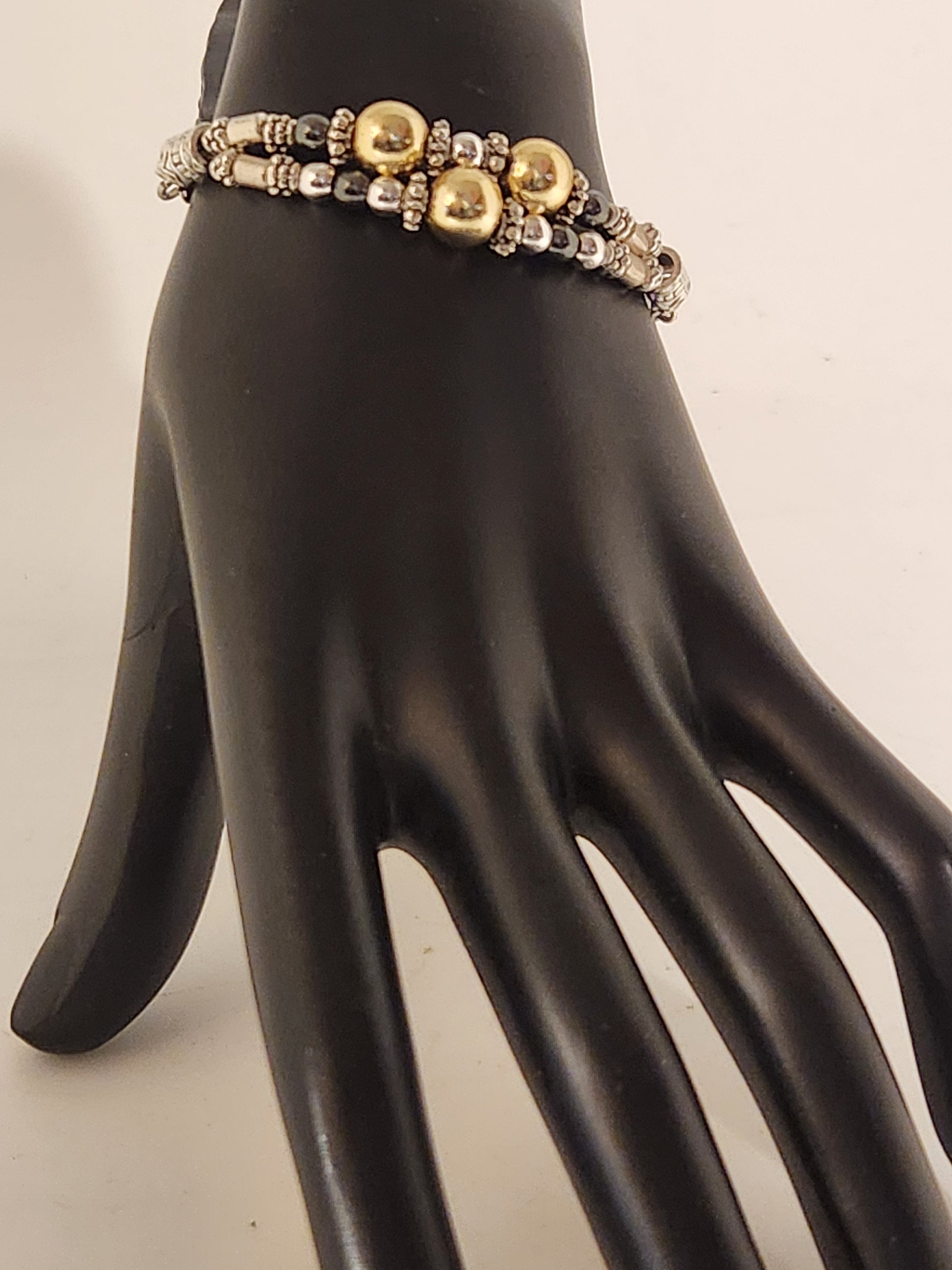 Our newest Bracelet is a double strand of 18K gold, and sterling silver over Hematite beads, combined with the classic grey hematite stones giving this piece an upgrade in looks and sophistication.