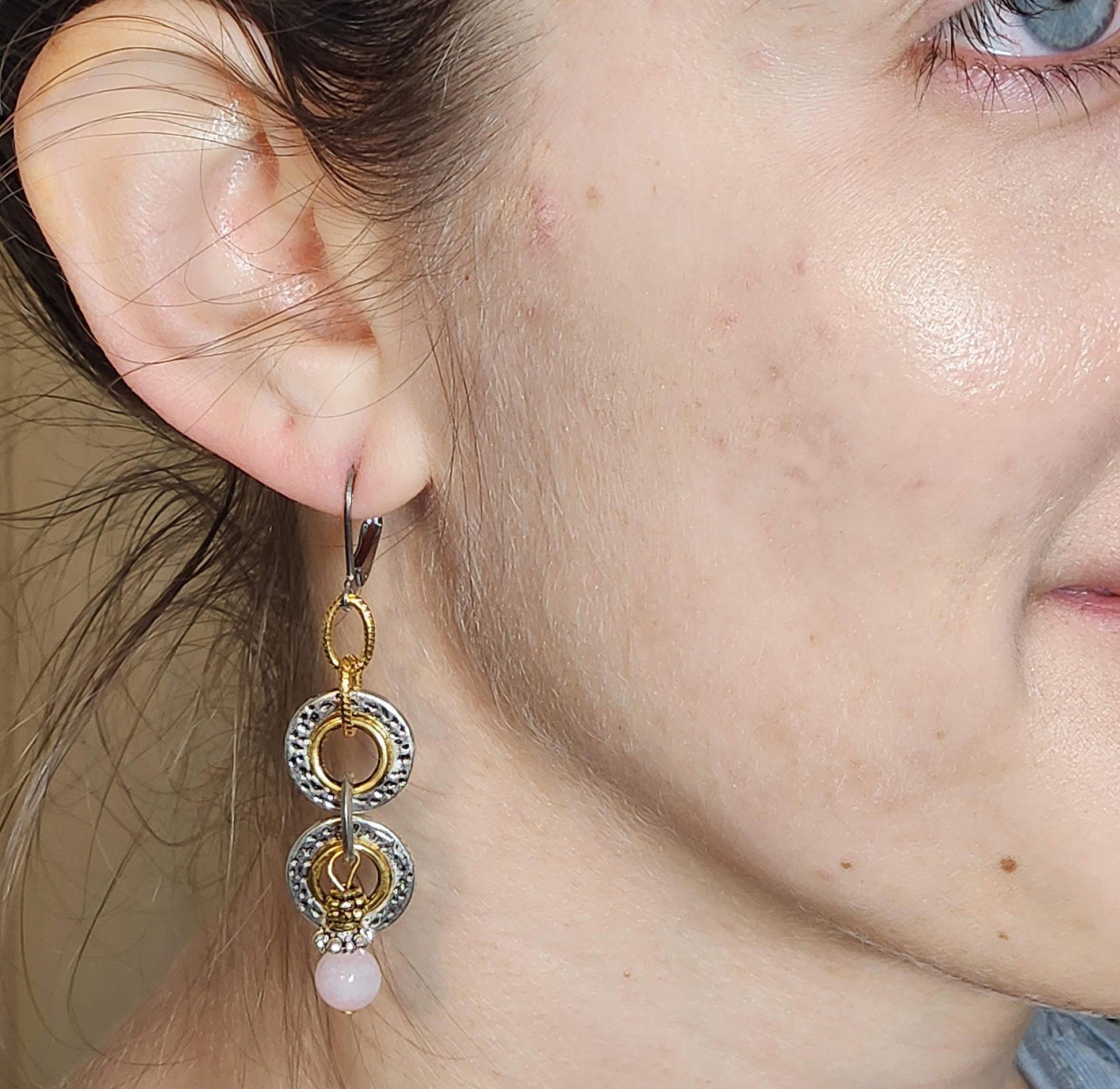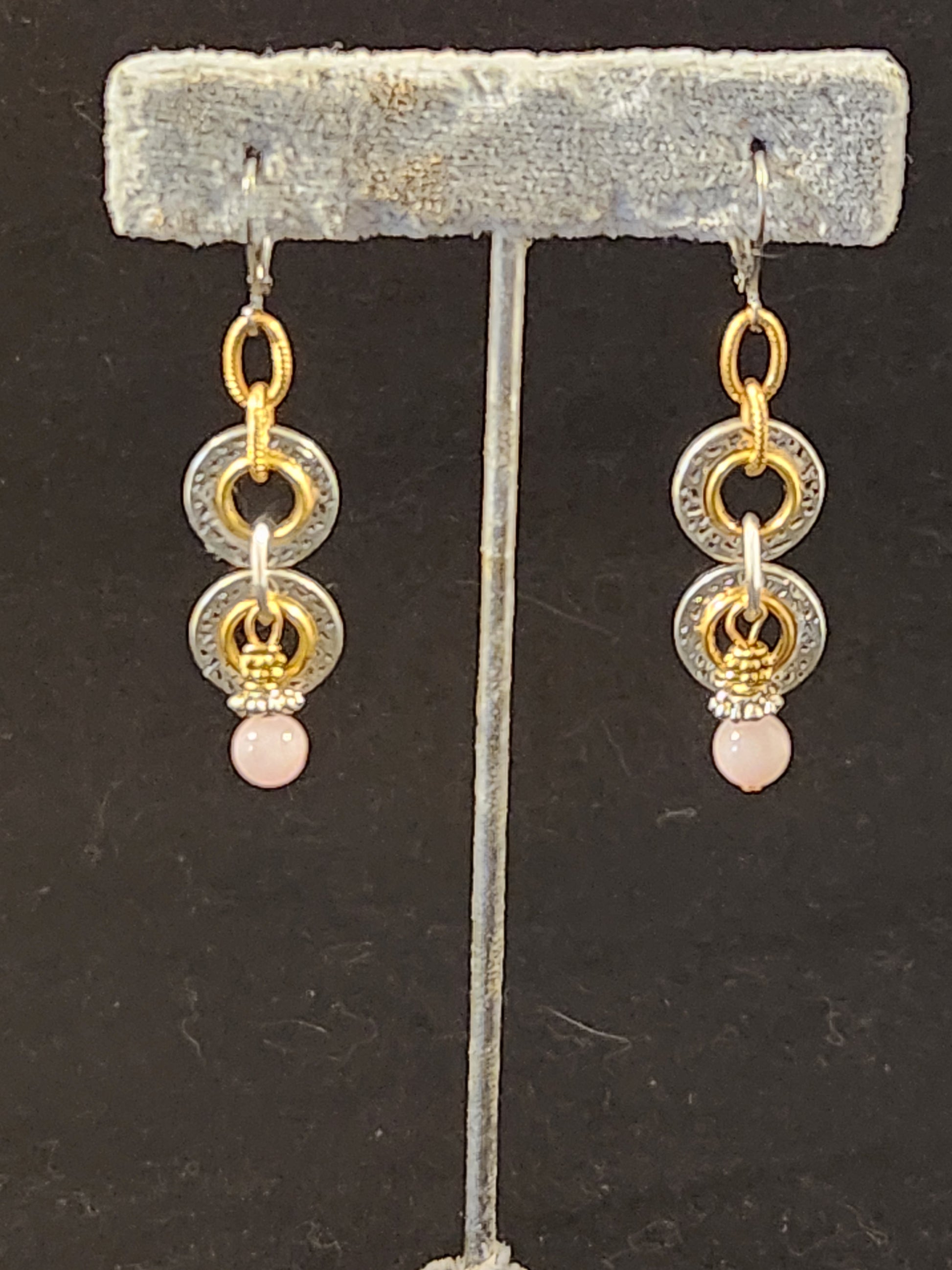 For those who like the dangle, but not too long this is the earring for you. Again, we combined gold and silver metals for that trendy look and added a stone element for the bottom. You can pick any of our 12 metaphysical stones on the STONE CHART if you want something different than "Rose Quartz" shown here.