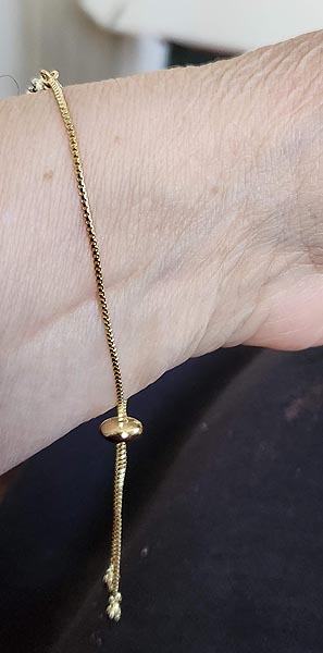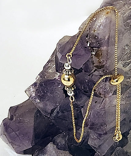 Our newest Bracelet is an 18K gold lg bead combined with an adjustable gold CHAIN with sterling silver over Hematite 4mm beads, combined with the classic grey hematite stones giving this piece an upgrade in looks and sophistication.