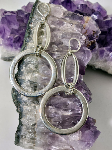These Sterling Silver lever back ear wires have hanging large silver ring drops are a show stopper.