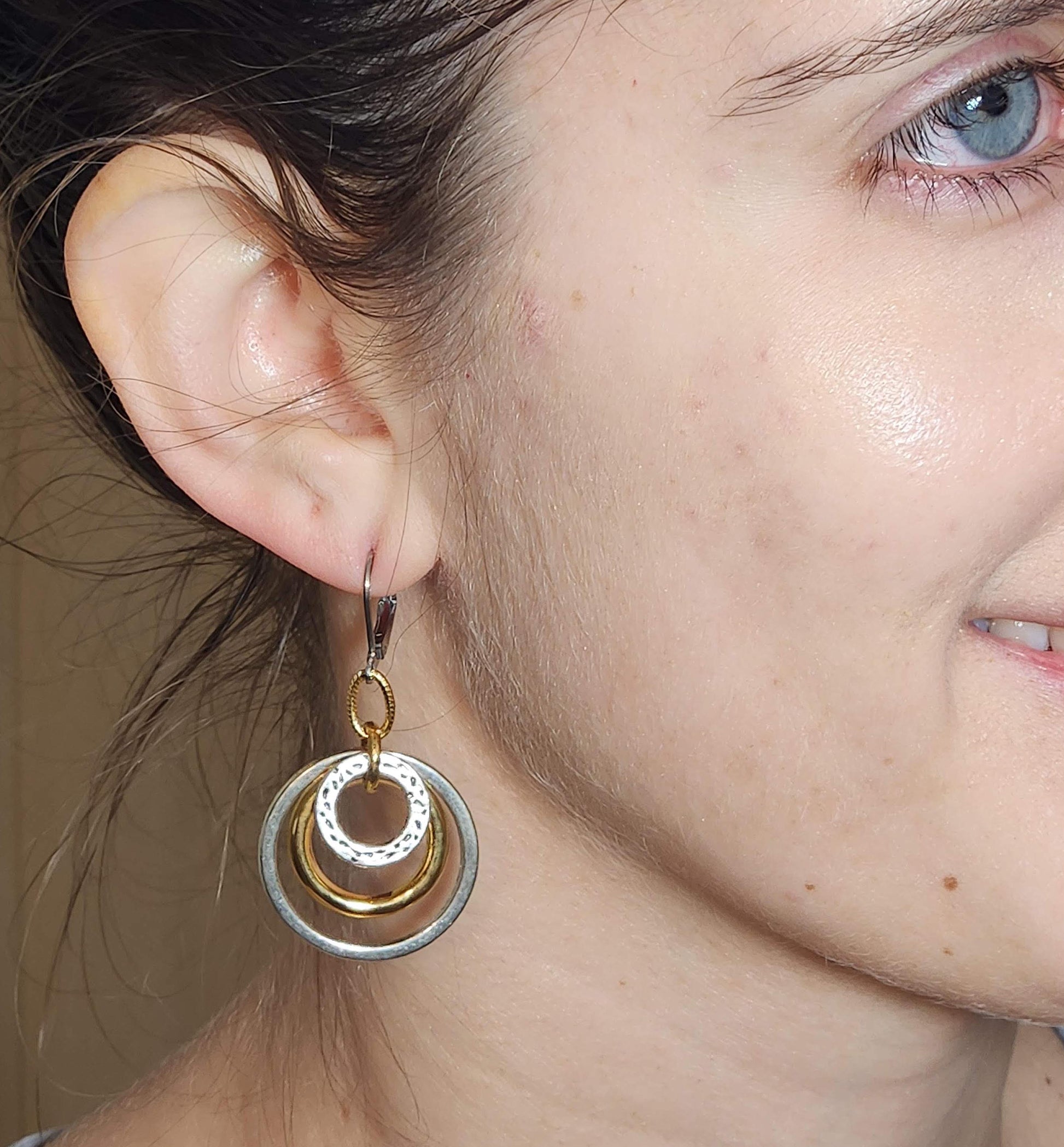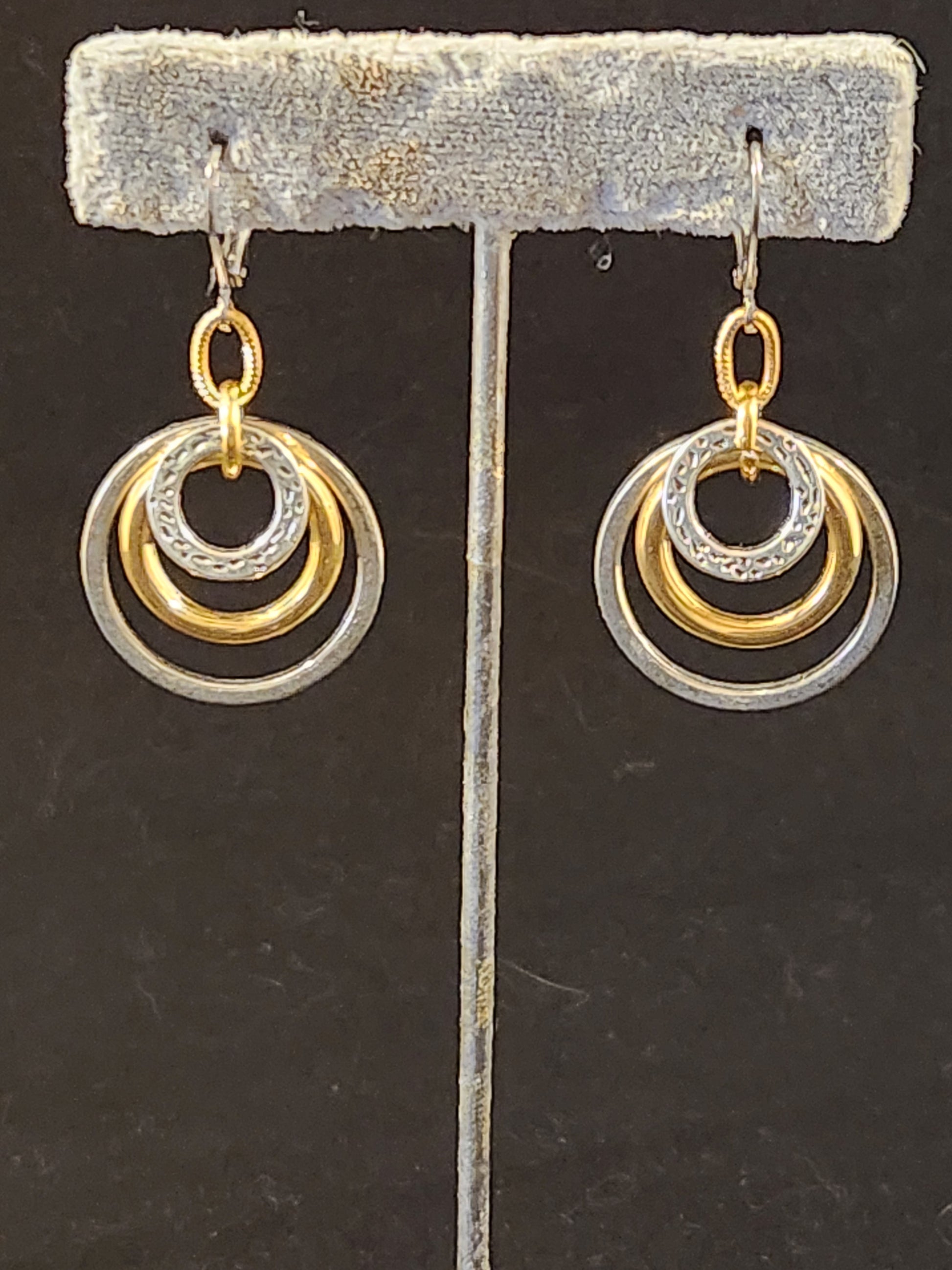 This is our medium 3 ring gold, silver earring. It's simple yet elegant and will go with anything from dress up to dress down. Light as a feather with a sterling silver lever back ear wire for easy on and off and for safety.
